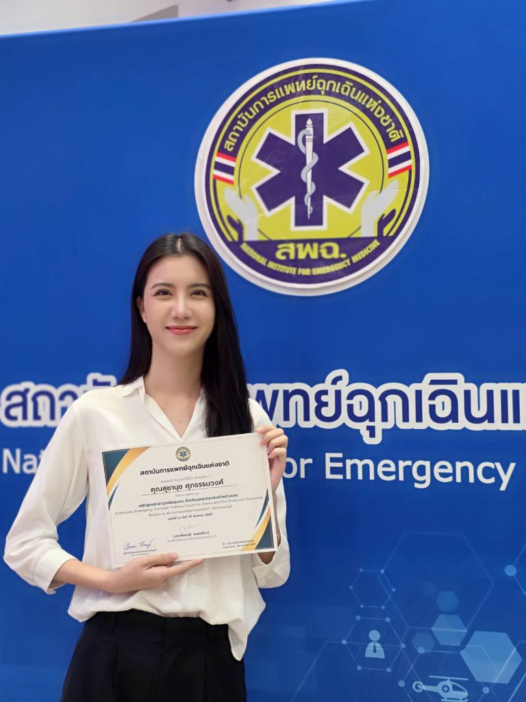 โดยมี ผู้ช่วยศาสตราจารย์ชายวุฒิ สววิบูลย์ ผู้อำนวยการฝึกอบรม เป็นผู้บรรยาย และได้รับเกียรติจาก นายพิเชษฐ์ หนองช้าง เลขาธิการสถาบันการแพทย์ฉุกเฉิน ผู้มอบใบประกาศนียบัตร หลังเสร็จจากการอบรม ณ สถาบันการแพทย์ฉุกเฉินแห่งชาติ จังหวัดนนทบุรี โดย กบ-ปภัสรา เผยถึงที่มาในครั้งนี้ว่า