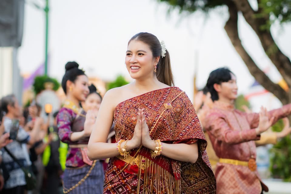 ได้มารำ และมาเป็นผู้นำขบวนแห่สงกรานต์วัดอรุณฯ ขอบคุณความเป็นอีสานที่ทำให้ได้มายืนตรงนี้ ท่านเลือกเพราะเป็นคนอีสาน รำอีสาน พูดอีสาน และเป็นลูกหลานมหาสารคามค่ะ