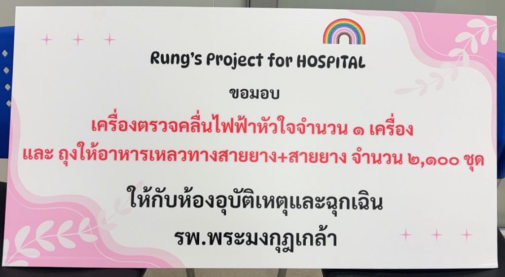 โดยกิจกรรมดีๆนี้ ถือเป็นที่แรกของการทำแคมเปญ “Rung’s Project for HOSPITAL” ที่คุณรุ้งได้เล่าให้ฟังว่า เวลามาใช้บริการที่โรงพยาบาลก็จะเป็นที่ทราบกันดี ถึงความหนาแน่นของคนไข้ที่มาใช้บริการ และตนเองก็เพิ่งทราบว่าการให้บริการประชาชนสิทธิการรักษาบัตรทอง(ประกันสุขภาพถ้วนหน้า สปสช. ) ของโรงพยาบาลในประเทศไทย เป็นประชาชนผู้มีรายได้น้อย ซึ่งโรงพยาบาลพระมงกุฎเกล้า กรมแพทย์ทหารบก นั้น มีผู้ใช้บริการอย่างต่อเนื่องและเป็นจำนวนมาก โดยเฉพาะอย่างยิ่ง ห้องอุบัติเหตุและฉุกเฉิน ที่มีการรับผู้ป่วยที่เป็นประชาชน สิทธิการรักษาบัตรทอง(ประกันสุขภาพถ้วนหน้า สปสช.) ไว้ในการสังเกตอาการ