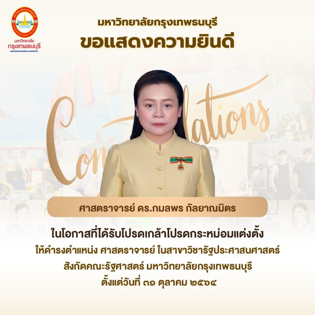 มีพระบรมราชโองการโปรดเกล้าโปรดกระหม่อมแต่งตั้งพนักงานมหาวิทยาลัย สังกัดมหาวิทยาลัยกรุงเทพธนบุรี ให้ดำรงตำแหน่ง “ศาสตราจารย์” ตั้งแต่วันที่มีคุณสมบัติครบถ้วนสมบูรณ์ โดยมหาวิทยาลัยกรุงเทพธนบุรีได้แก่ “รองศาสตราจารย์กมลพร กัลยาณมิตร” สังกัดคณะรัฐศาสตร์ มหาวิทยาลัยกรุงเทพธนบุรี ให้ดำรงตำแหน่ง ศาสตราจารย์ ในสาขาวิชารัฐประศาสนศาสตร์ สังกัดคณะรัฐศาสตร์ มหาวิทยาลัยกรุงเทพธนบุรี ตั้งแต่วันที่ 31 ตุลาคม 2564